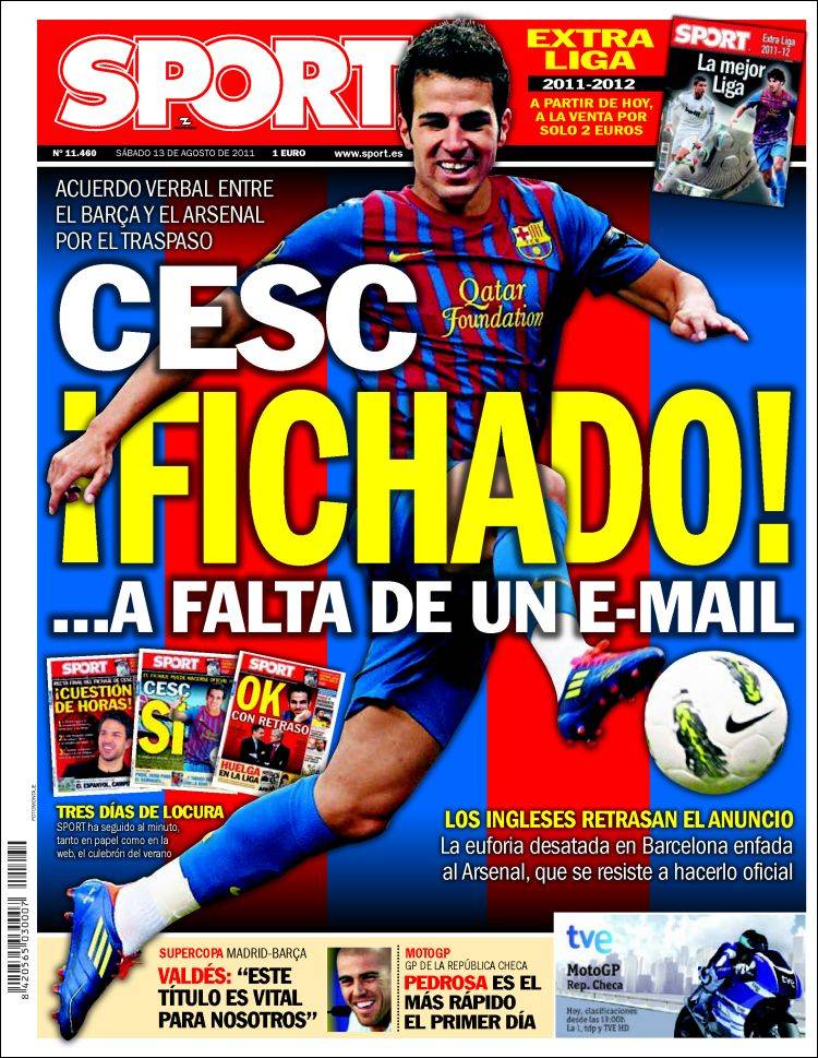 SPORT FABREGAS – Sul quotidiano spagnolo Sport si parla di Fabregas. Manca solo un’email per il suo annuncio finale.