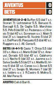 JUVENTUS BETIS SIVIGLIA VOTI GAZZETTA AMICHEVOLE – Termina con il risultato di 0 a 0 l’amichevole fra la Juventus e il Betis di Siviglia giocata ieri sera a Salerno. La Vecchia Signora pareggia e non convince. La mancanza di gioco il maggior “difetto” riscontrato per circa 3/4 della gara. Di seguito i voti dell’amichevole pubblicati da La Gazzetta dello Sport.