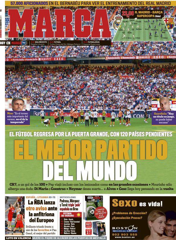 MARCA BARCELLONA REAL MADRID SUPERCOPPA DI SPAGNA MOURINHO GUARDIOLA – L’apertura del quotidiano spagnolo Marca è dedicata alla partita valida per l’andata della Supercoppa di Spagna che si disputerà questa sera tra il Real Madrid e il Barcellona al Santiago Bernabeu definita dal quotidiano spagnolo la miglior partita del mondo.