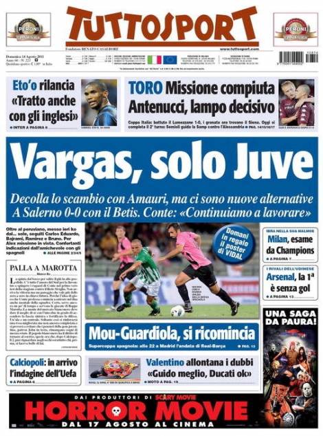 TUTTOSPORT JUVENTUS VARGAS FIORENTINA MERCATO – La prima pagina di Tuttosport si apre con il titolo riservato alla trattativa che la Juventus sta effettuando per portare in bianconero l’esterno sinistro peruviano Juan Manuel Vargas e del pareggio nella gara amichevole giocata con il Betis Siviglia nella serata di ieri.