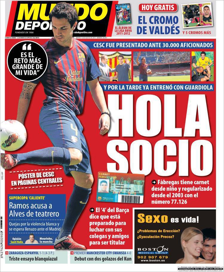 MUNDO DEPORTIVO BARCELLONA – Sul quotidiano Mundo Deportivo si parla di Fabregas che è stato presentato dal Barcellona. Fabregas ha da anni la tessera di socio del Barcellona.