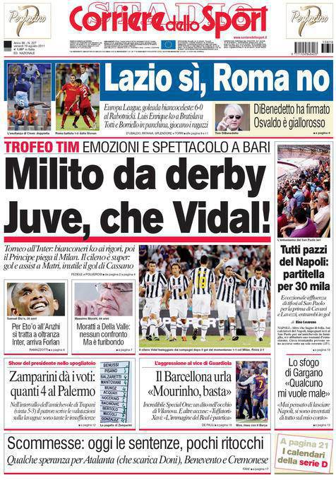 Corriere dello Sport: Milito da derby, Juve che Vidal 19/08/2011 di Ruggieri CORRIERE MILAN VIDAL – Sul Corriere dello Sport si parla del trofeo Tim vinto dall’Inter con Milito e Vidal protagonisti. Claudio Ruggieri – www.calciomercatonews.com
