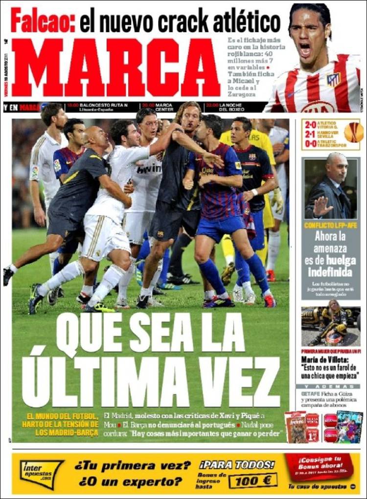 MARCA REAL MADRID – Il quotidiano spagnolo Marca si augura che tra Real Madrid e Barcellona non ci sia più rissa a fine partita.