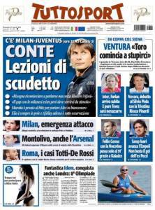TUTTOSPORT JUVENTUS CONTE SCUDETTO – La prima pagina di Tuttosport trova al centro la fotografia del nuovo tecnico della Juventus Antonio Conte e riprende una dichiarazione rilasciata ieri dallo stesso tecnico in conferenza stampa: “Scudetto è una parola a cui dobbiamo riabituarci”. Inoltre viene presentato il Trofeo Berlusconi che si svolgerà stasera a San Siro contro il Milan.