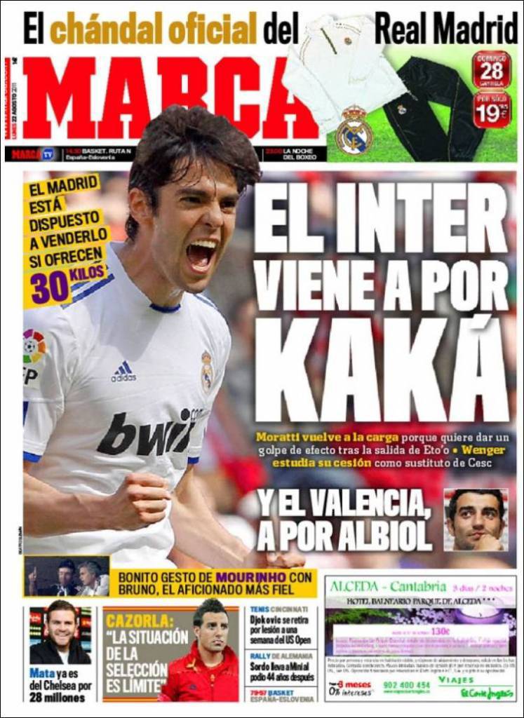 MARCA INTER KAKA’ – Sul quotidiano Marca si parla di mercato con l’Inter che sembra intenzionata a portare Kakà in nerazzurro.