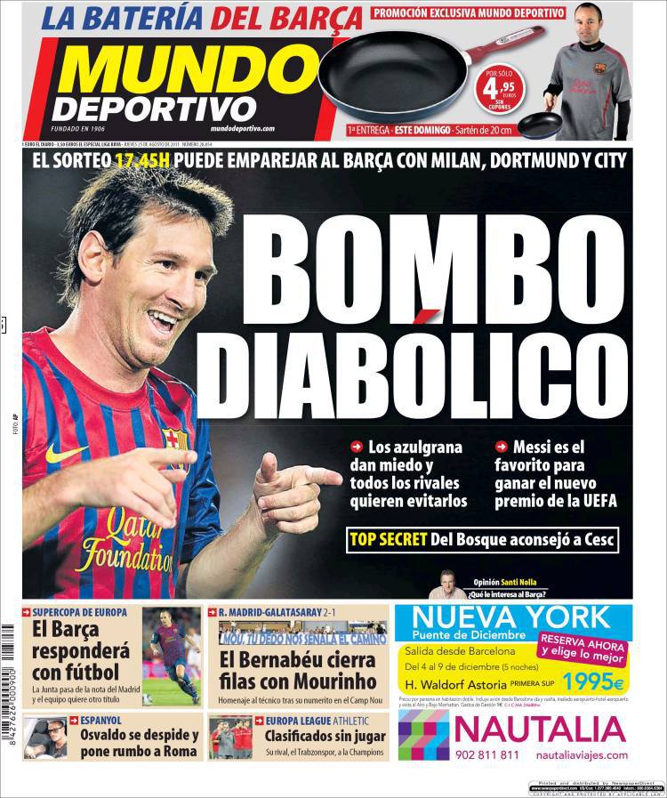 MUNDO DEPORTIVO BARCELLONA – Sul quotidiano Mundo Deportivo si parla del sorteggio di Champions League che si effettuerà oggi pomeriggio alle ore 17.45. Il Barcellona potrebbe incontrare squadre importanti.