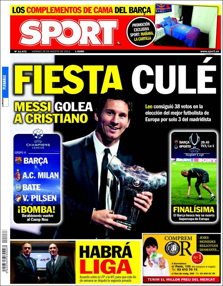SPORT BARCELLONA MESSI – Anche l’altro quotidiano catalano Sport ha parlato della vittoria di Messi su Cristiano Ronaldo come miglior giocatore della scorsa Champions League.