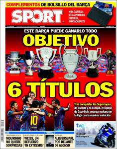 Sport: Barcellona, obiettivo sei titoli 28/08/2011 di admin RASSEGNA STAMPA SPORT BARCELLONA – Il Barcellona non ha più confini, Sport si chiede se quest’anno gli uomini di Guardiola riusciranno ad aggiudicarsi tutti e sei i trofei a disposizione. Paolo Bardelli – calciomercatonews.com