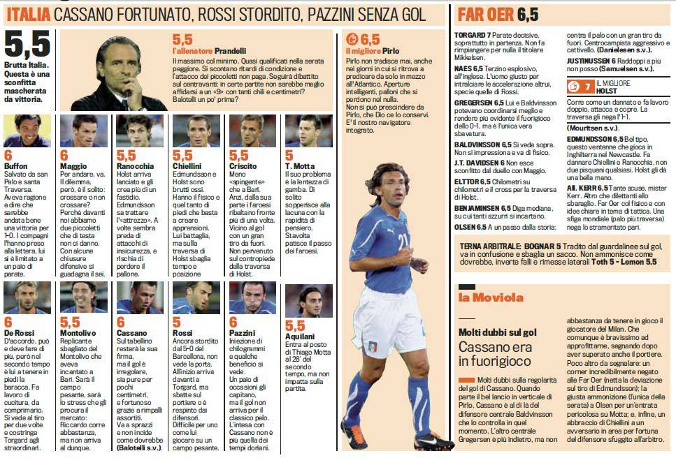 EURO 2012 ITALIA FAR OER – Alla fine l’Italia è riuscita a portare tre punti importantissimi per chiudere (quasi) il discorso qualificazione a Euro 2012. La vittoria di misura contro le Far Oer per 1 a 0 non è però di certo qualcosa di cui andare fieeri, vista la difficoltà nel portare a casa il risultato contro una delle formazioni più modeste del continente. Ecco perchè le pagelle della squadra azzurra (qui sotto) sono così basse…