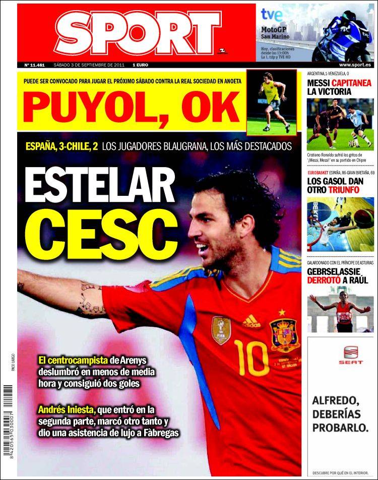 SPORT FABREGAS – Sul quotidiano Sport si parla di Fabregas autore di due gol con la maglia della Spagna.