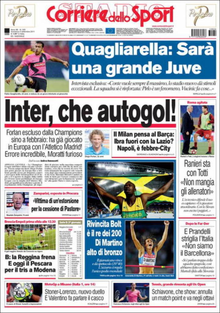 CORRIERE DELLO SPORT INTER – La testata Romana, il Corriere dello Sport, fa un focus sul clamoroso errore compiuto dai dirigenti dell’Inter, i quali hanno inserito nella lista Champions Diego Forlan, nuovo acquisto nerazzurro, non impiegabile in Champions, data l’avvenuta presenza nel preliminare di Europa League con la maglia dell’Atletico Madrid.