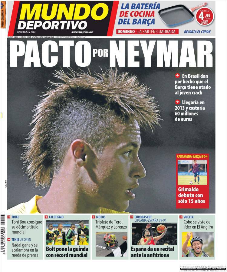 MUNDO DEPORTIVO NEYMAR – Sul quotidiano catalano Mundo Deportivo si parla di Neymar, talento brasiliano del Santos che è vicino al Barcellona. Il suo arrivo sarebbe già stato fissato per gennaio 2013.