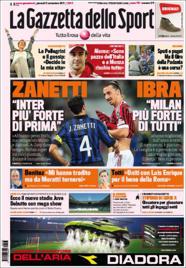 GAZZETTA DELLO SPORT ZANETTI IBRA – Bel confronto quest’oggi sulla prima pagina della Gazzetta dello Sport: Milan o Inter? Zanetti o Ibrahimovic?