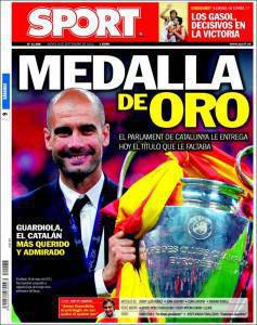 Sport: Medaglia d’oro 08/09/2011 di admin SPORT MEDAGLIA D’ORO – Il quotidiano Sport annuncia che Pep Guardiola verrà insignito, dal parlamento Catalano, dellaMedaglia d’oro al Valore. Mauro Piro – www.calciomercatonews.com
