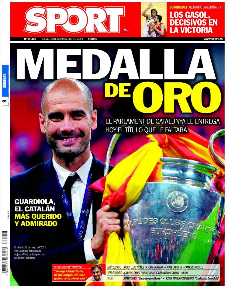 SPORT MEDAGLIA D’ORO – Il quotidiano Sport annuncia che Pep Guardiola verrà insignito, dal parlamento Catalano, dellaMedaglia d’oro al Valore.