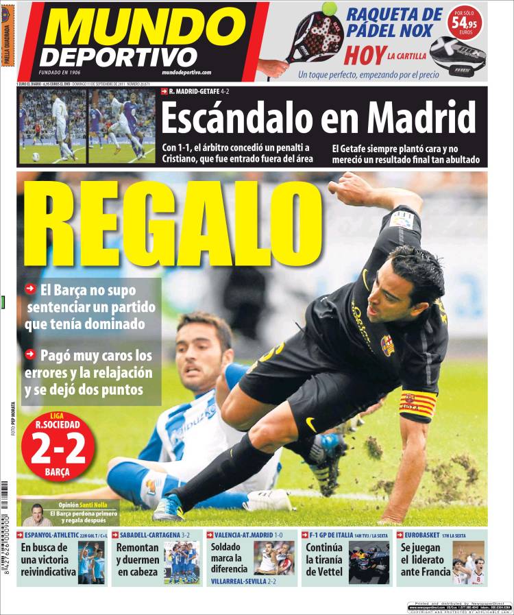 MUNDO DEPORTIVO REGALO – Ha qualcosa da recriminare il Barcellona dopo la sfortunata partita di ieri contro la Real Sociedad. Passata in vantaggio per due volte, si è vista raggiungere dai padroni di casa per ben due volte. Un regalo dei Catalani secondo Mundo Deportivo.