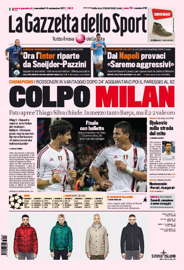 GAZZETTA MILAN – La Gazzetta dello Sport parla del pareggio del Milan sul campo del Barcellona per due a due. Ma è stato dominio Barça.