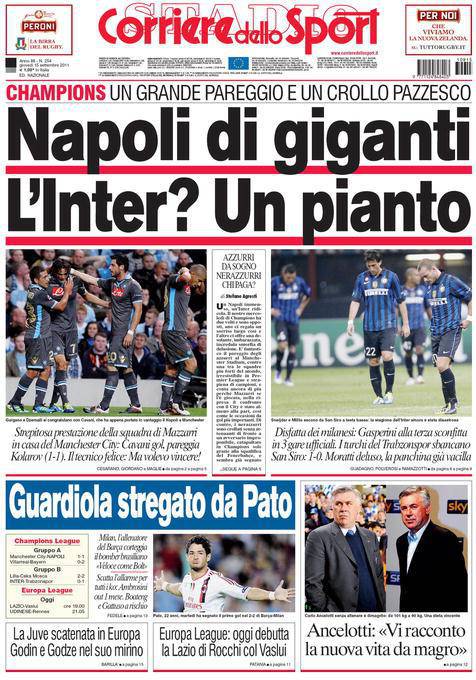 CORRIERE NAPOLI INTER – Sul Corriere dello Sport si parla del Napoli che pareggia sul campo del City e dell’Inter che perde in casa contro il Trabzonspor.