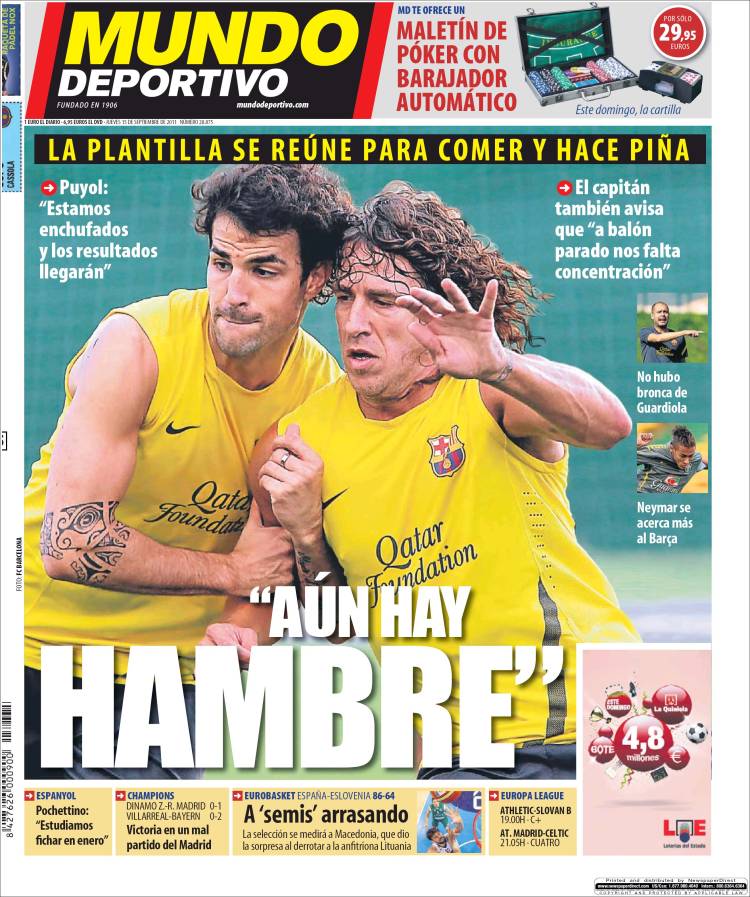 Mundo Deportivo: “C’è ancora fame” 15/09/2011 di Ruggieri MUNDO DEPORTIVO PUYOL – Sul quotidiano Mundo Deportivo vengono riportate le dichiarazioni di Puyol che afferma di avere ancora fame di vittoria. Claudio Ruggieri – www.calciomercatonews.com