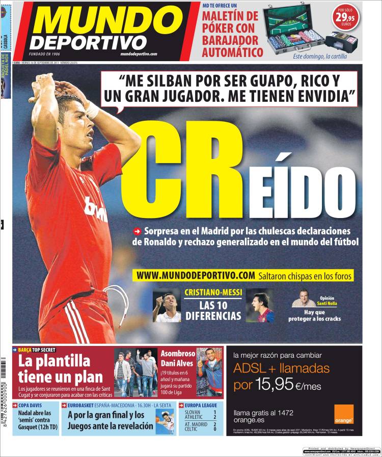MUNDO DEPORTIVO RONALDO – Ronaldo ha dichiarato che è invidiato da molti suoi colleghi, Mundo Deportivo non è d’accordo.