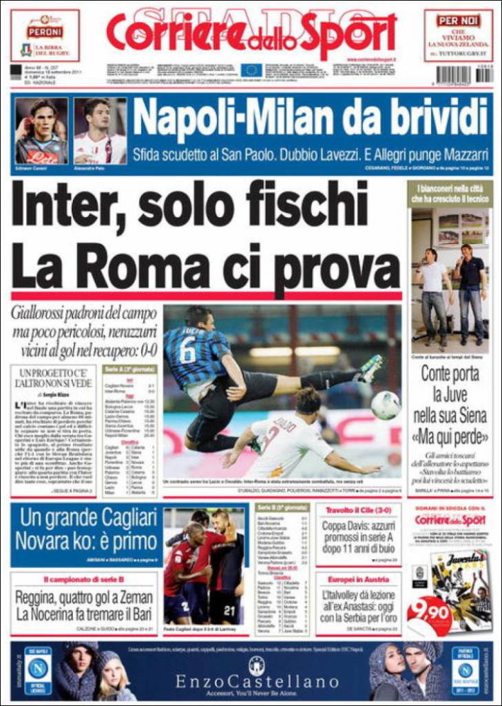 CORRIERE DELLO SPORT INTER ROMA – Riassunto perfetto della partita di ieri sera, è stato portato quest’oggi in edicola dal Corriere dello Sport. Una brutta partita giocata dall’Inter che ha, meritatamente, raccolto fischi dai suoi tifosi. Prime prestazioni positive invece per la Roma di Luis Enrique che però non raccoglie molto dalla trasferta di Milano.