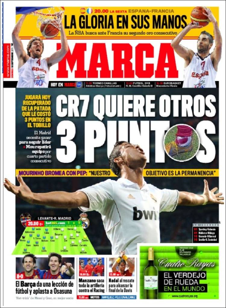 MARCA CR7 – Cristiano Ronaldo è davvero affamato: altri 3 punti per il suo Real Madrid, come leggiamo sulla prima pagina di Marca. Il giocatore, in uno stato di forma eccellente, guiderà i suoi nella trasferta di Levante.