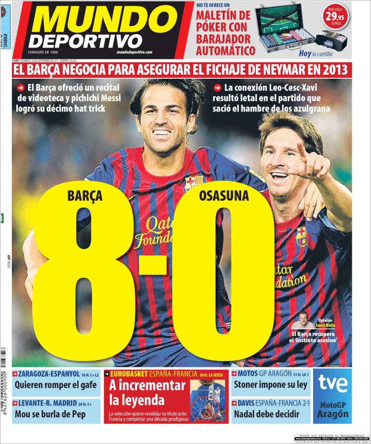 MUNDO DEPORTIVO 8-0 – Incredibile risultato ieri sera nella Liga Spagnola? Sarebbe incredibile se non stessimo parlando del Barcellona che, ieri sera, ha rifilato una lezione di calcio all’Osasuna: 8 reti di scarto, come ormai ci ha abituato da varie stagioni. Il titolo de “El Mundo Deportivo”, dunque, si commenta da solo…