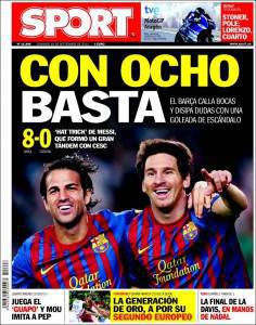 SPORT OTTO BASTA – Largo risultato, ieri sera, del Barcellona che ha umiliato l’Osasuna. Sono 8 i gol rifilati dai Blaugrana, con triplo Messi. Proprio il protagonista della partita di ieri è insieme a Fabregas sulla prima pagina del quotidiano Spagnolo Sport.