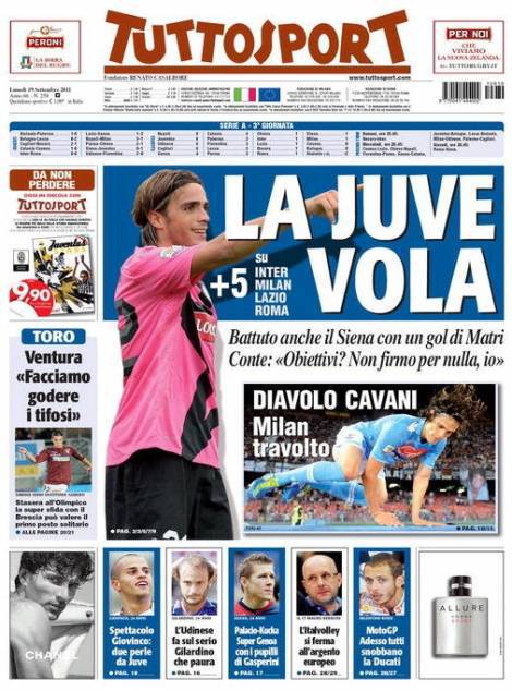 TUTTOSPORT JUVENTUS – La Juventus di Conte prima in classifica dopo la vittoria contro il Siena firmata da Matri.