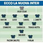 Ritorno alla vecchia guardia, con Maicon, ristabilito, a destra, Sneijder dietro le punte e in attacco coppia Pazzini-Forlan. Novità Zanetti che giocherà a sinistra come terzino, mentre Thiago Motta e Stankovic dovrebbero affiancare Cambiasso. Ecco l’undici che ha in mente Ranieri.