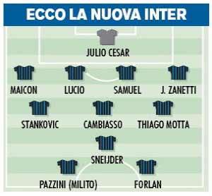 Ritorno alla vecchia guardia, con Maicon, ristabilito, a destra, Sneijder dietro le punte e in attacco coppia Pazzini-Forlan. Novità Zanetti che giocherà a sinistra come terzino, mentre Thiago Motta e Stankovic dovrebbero affiancare Cambiasso. Ecco l’undici che ha in mente Ranieri.
