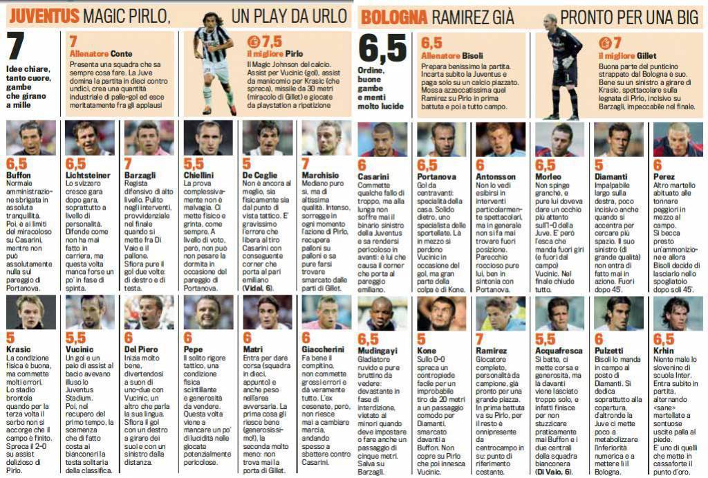 FANTACALCIO JUVENTUS BOLOGNA VOTI PAGELLE GAZZETTA – La Juventus impatta in casa contro il Bologna per uno a uno. Bianconeri in vantaggio con Vucinic grazie a un’invenzione di Pirlo, mentre il pareggio arriva nel secondo tempo con Portanova con la Juventus in dieci per l’espulsione di Vucinic. Ecco i voti e le pagelle della Gazzetta dello Sport.