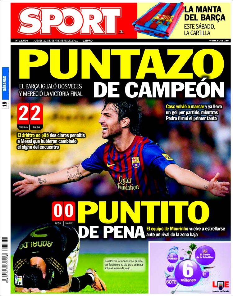 SPORT BARCELLONA REAL MADRID – Sul quotidiano Sport si parla del pareggio del Barcellona sul campo del Valencia e di quello del Real Madrid sul campo del Racing.