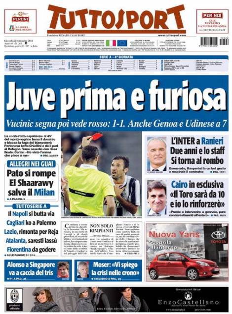 TUTTOSPORT JUVENTUS – Tuttosport parla della Juventus che pareggia uno a uno in casa contro il Bologna. Vucinic espulso.