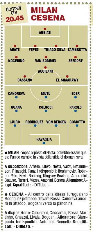 FANTACALCIO MILAN CESENA PROBABILI FORMAZIONI CORRIERE – Massimiliano Allegri dovrà fare a meno di undici titolari contro il Cesena. Il tecnico del Milan lascerà a riposo Nesta mentre in attacco giocheranno El Shaarawy-Cassano con Aquilani trequartista. Nel Cesena invece confermato il modulo 4-3-3 con Mutu in attacco sostenuto da Eder e Candreva. Ecco le probabili formazioni del Corriere dello Sport.