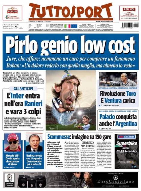 TUTTOSPORT PIRLO – Su Tuttosport si elogia Andrea Pirlo, centrocampista della Juventus, arrivato in estate a parametro zero.