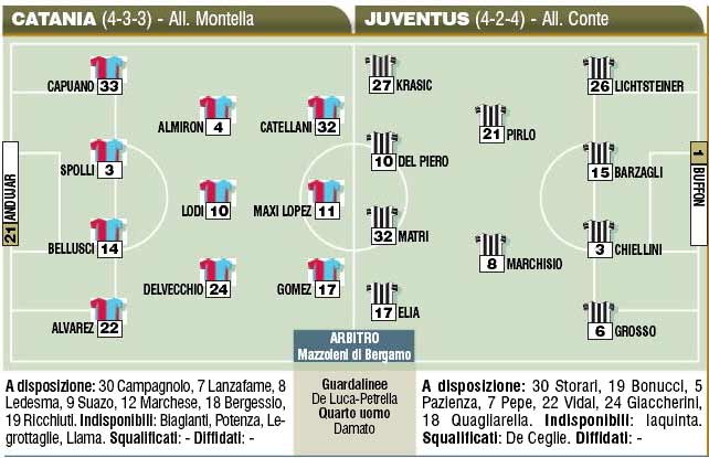 FANTACALCIO CATANIA JUVENTUS PROBABILI FORMAZIONI CORRIERE – La Juventus quest’oggi farà visita al Catania di Montella e cercherà di riprendere la striscia di vittorie. Conte, tecnico bianconero, non cambia modulo ma inserisce dal primo minuto l’olandese Elia. Ecco le probabili formazioni secondo il Corriere dello Sport.