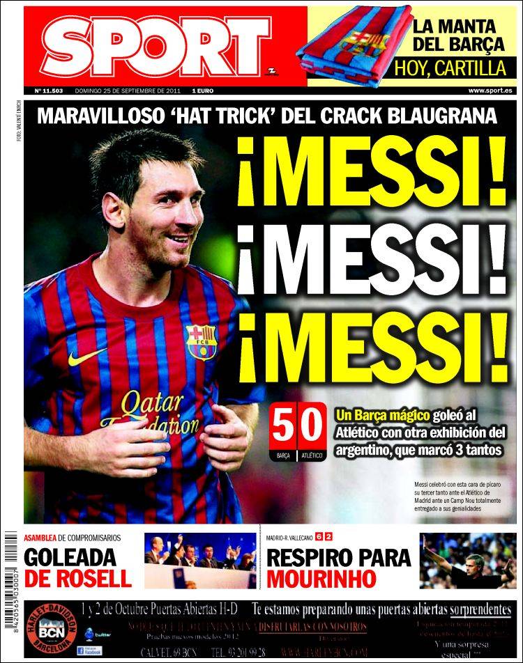 SPORT MESSI – Titolo uguale per il quotidiano Sport che parla della tripletta di Messi.