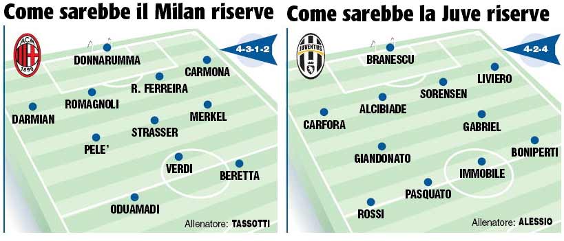 MILAN JUVENTUS FOTO RISERVE CALCIO – Nei giorni scorsi il vicepresidente della Figc Demetrio Albertini ha parlato di introdurre anche nel calcio italiano il campionato delle riserve, dedicato a quei giovani che una volta usciti dalla Primavera non hanno molto spazio per giocare in prima squadra. Un po’ come succede in Inghilterra e in Spagna. Tuttosport ha vooluto schierare le due formazioni di Milan e Juventus riserve, facendo un confronto tra le due società. Tanti giovani nel Milan e nella Juventus. Un’idea che potrebbe davvero salvare il calcio italiano e anche la carriera di molti giovani talenti. Ecco la foto.