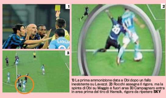 Il disastro Altro sbaglio di Rocchi al 33′: non vede uno sgambetto di Zanetti da ammonizione su Lavezzi al limite dell’area. Al 37′ Chivu stende Lavezzi: giallo ok. La partita deraglia al 41′ quando Rocchi non aiutato da Nicoletti dà un rigore al Napoli per la spinta di Obi a Maggio: il fallo è nettamente fuori area. Oltre al danno la beffa: per Obi arriva il secondo giallo. Non solo, il rigore andava ripetuto perché Campagnaro insieme con Samuel entra in area prima della battuta di Hamsik. Lo svantaggio fa saltare i nervi all’Inter: ammonito Zanetti per proteste dopo un fallo laterale dato al Napoli. E poi è Julio Cesar a scagliarsi in modo veemente contro Rocchi probabilmente perché il portiere si era accorto della irregolarità di Campagnaro: arriva l’ammonizione, ma ci stava anche il rosso. I torti arbitrali fanno perdere la calma anche a Ranieri che discute con l’arbitro a fine primo tempo: espulso. Nella ripresa clima meno infuocato. Pazzini se la prende per due segnalazioni di fuorigioco di Nicoletti, ma ha ragione l’assistente. Al 29′ ammonito Mascara per perdita di tempo. Bravo ancora Romagnoli in occasione del 3-0 di Hamsik tenuto in gioco da Maicon.