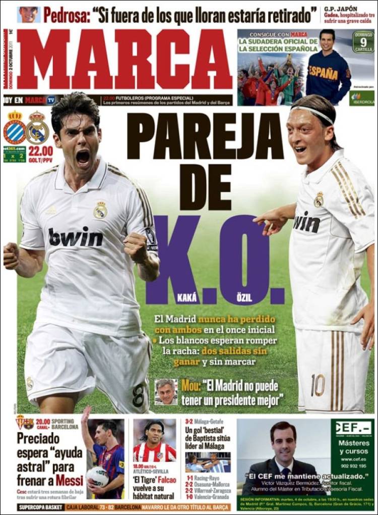 MARCA KAKA’ OZIL – Sul quotidiano Marca si parla di Kakà e Ozil, una coppia che potrebbe mettere k.o. l’Espanyol.