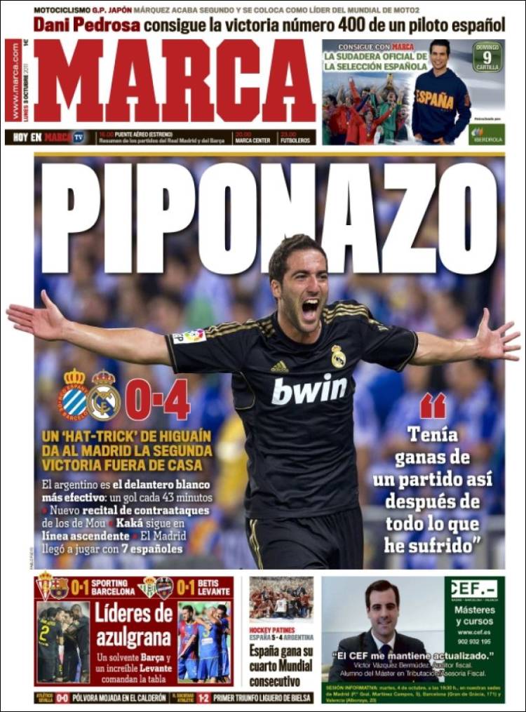 MARCA HIGUAIN – Sul quotidiano Marca si parla di Higuain che segna una tripletta importante nel quattro a zero del Real Madrid sull’Espanyol.