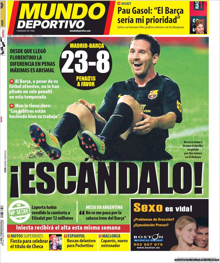 MUNDO DEPORTIVO RIGORI – Sul quotidiano catalano Mundo Deportivo si parla di scandalo per quanto riguarda i rigori assegnati, 23 quelli del Real Madrid, solo 8 al Barcellona.