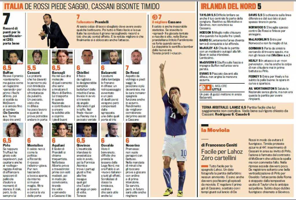 ITALIA IRLANDA DEL NORD VOTI PAGELLE GAZZETTA – L’Italia di Prandelli vince l’ottavo match in dieci partite e conquista il record di punti. Ottima la prova di Cassano, autore di due gol, il terzo gol è arrivato per uno sfortunato autogol degli irlandesi. Ecco i voti e le pagelle della Gazzetta dello Sport.