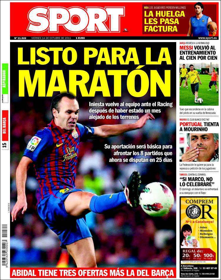 Sport: Pronto per la maratona 14/10/2011 di Ruggieri SPORT INIESTA – Anche Sport parla del recupero di Iniesta, pedina fondamentale per il Barcellona di Guardiola. Claudio Ruggieri – www.calciomercatonews.com