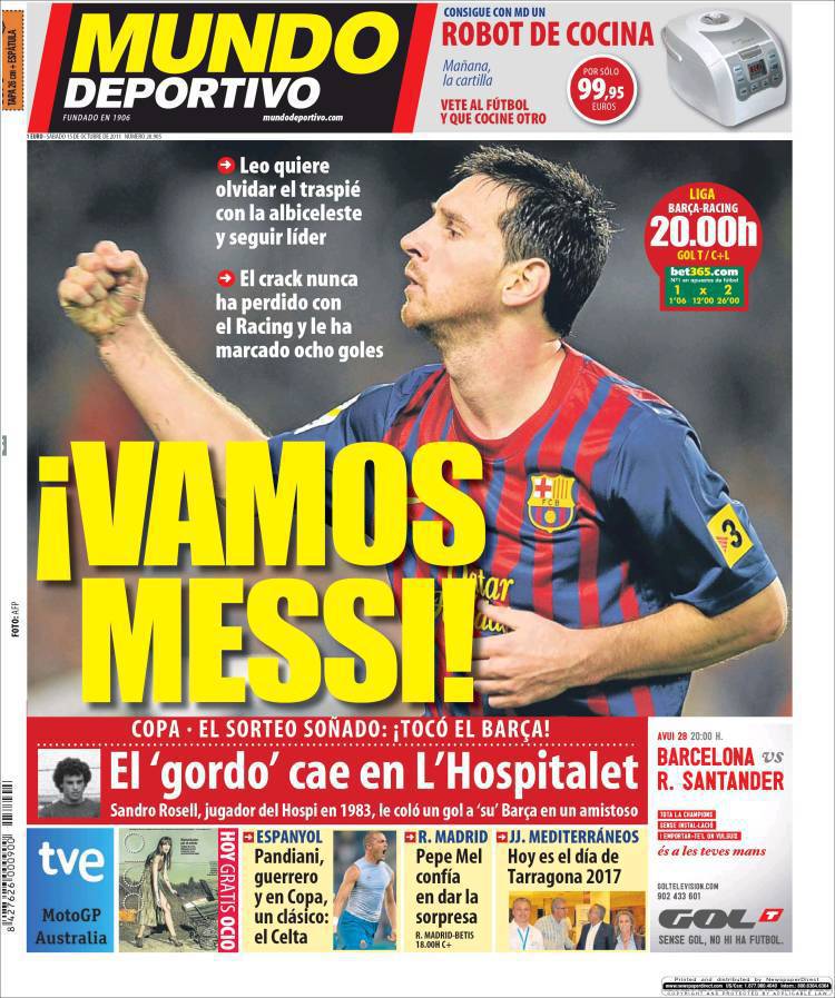 MUNDO DEPORTIVO MESSI – Sul quotidiano catalano Mundo Deportivo si parla di Messi che dovrà portare alla vittoria il Barcellona contro il Racing.