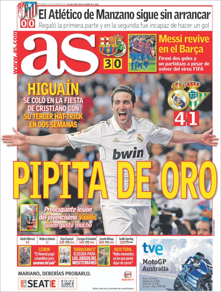 RASSEGNA STAMPA AS – Anche AS, quotidiano madrileno, si gode la tripletta del “Pipita, questo il soprannome di Gonzalo Higuain. In taglio alto, una fotonotizia ci ricorda la vittoria del Barcellona contro il Racing Santander.