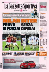 GAZZETTA DELLO SPORT MILAN INTER – Ecco la prima pagina della Gazzetta in edicola oggi. In evidenza le due prestazini delle milanesi, con la grande vittoria del Milan e la pessima prestazione interista. In taglio alto, il ko interno del Napoli.