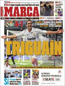 Marca: Triguain! 16/10/2011 di admin RASSEGNA STAMPA MARCA – Seconda tripletta in due settimane per Gonzalo Higuain che stende il Betis Siviglia. Ottima anche la prestazione di Kakà che esce tra gli applausi, dopo uno splendido gol. Alberto Santi – www.calciomercatonews.com