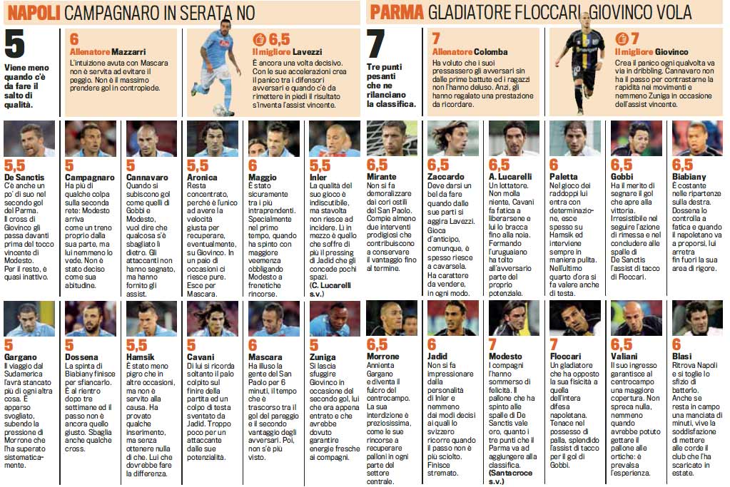 SERIE A NAPOLI PARMA VOTI PAGELLE GAZZETTA – Brutta caduta in casa per il Napoli, che si fa superare 2 a 1 da un grande Parma. Ducali in vantaggio grazie alla rete di Gobbi, bravissimo a insaccare uno splendido colpo di tacco di Sergio Floccari. Mister Mazzarri getta Mascara nella mischia, e l’ex attaccante del Catania non delude, segnando la rete del momentaneo pareggio. Ma con il più classico dei contropiedi arriva il raddoppio: Giovinco mette una palla forte e bassa in mezzo e Modesto è il più veloce di tutti a ribadirla in gol: 2 a 1. Inutile il forcing finale, che vede Cavani colpire un palo da posizione ravvicinata. I migliori: Lavezzi (6,5) e Giovinco (7).